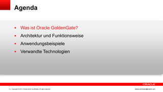 Oracle GoldenGate ist eine eigenständige Replikationslösung, die Daten in Echtzeit zwischen heterogenen Datenbanken auf Transaktionsebene repliziert. Es bietet eine modulare Architektur zur kontinuierlichen Synchronisation und Datenmigration ohne Downtime, unterstützt viele Datenbanktypen und ist flexibel konfigurierbar. Die Lösung ermöglicht auch bidirektionalen Datentransfer und sorgt für hohe Fehler- und Ausfallsicherheit.