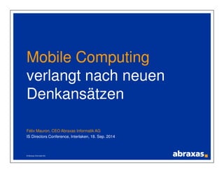 Die Directors Conference im September 2014 befasste sich mit den Herausforderungen, die mobile Computing für Unternehmen mit sich bringt, und betonte die Notwendigkeit neuer Denkansätze. Abraxas Informatik AG, unter der Leitung von CEO Félix Mauron, bietet umfassende IT-Dienstleistungen und Lösungen für die öffentliche Hand in der Schweiz an. Die Veranstaltung thematisierte auch die Chancen, die sich aus der Konsumerisierung und der mobilen Revolution ergeben.
