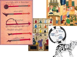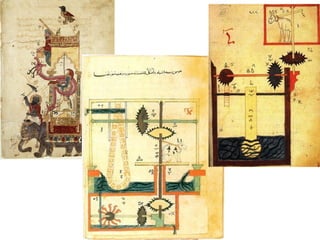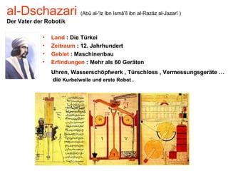 Das Dokument beschreibt bedeutende muslimische Wissenschaftler und ihre Erfindungen im Laufe der Jahrhunderte, darunter Al-Dschazari, der als Vater der Robotik gilt, Alhazen, der als Vater der modernen Optik anerkannt ist, und Abbas ibn Firnas, der erste Flugversuche unternahm. Es hebt auch die medizinischen Beiträge von Al-Bucasis und die Entwicklungen im Bereich der Astrologie durch Miriam hervor. Insbesondere wird die Vielfalt der Disziplinen wie Maschinenbau, Optik, Medizin und Physik betont.