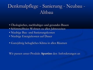 Das Dokument beschreibt eine innovative Isolationsmethode namens Apartiso, die ökologisch und nachhaltig ist und Vorteile wie eine verbesserte Energieeffizienz, Schimmelschutz und Kosteneinsparungen bei Bau- und Sanierungsprojekten bietet. Die Technik basiert auf einem zweilagigen Reflexionsfolien-System, das eine effektive Temperaturregulierung ohne Verlust der Raumwärme ermöglicht. Kritisch wird auf die Probleme der herkömmlichen Dämmstoffe hingewiesen, die Feuchtigkeit und Schimmel begünstigen können, sowie auf die gesundheitlichen Risiken durch unzureichenden Luftaustausch in modernen, luftdichten Gebäuden.