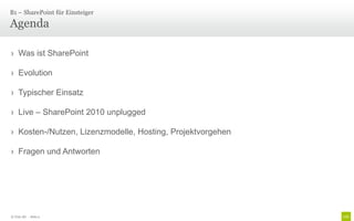 Das Dokument bietet eine Einführung in SharePoint 2010, einschließlich seiner Evolution, typischen Einsatzmöglichkeiten und Projektvorgehen. Es wird hervorgehoben, dass SharePoint als Plattform für Zusammenarbeit und Informationsmanagement dient und die Benutzerfreundlichkeit sowie Integration von verschiedenen Tools betont wird. Außerdem werden Lizenzmodelle und Trends wie Cloud-Hosting diskutiert, um Unternehmen bei der optimalen Nutzung zu unterstützen.
