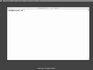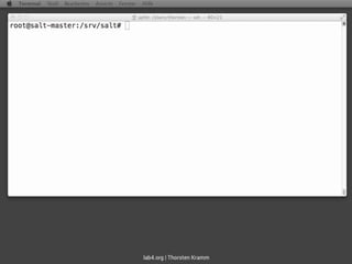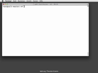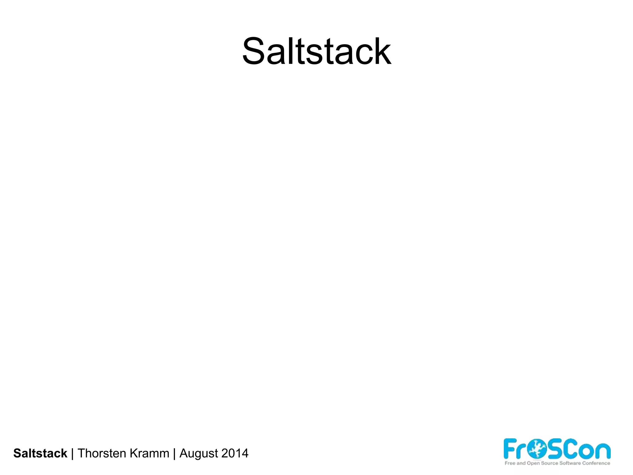 saltstack ist ein Tool zur Automatisierung und Verwaltung von Computersystemen, das es ermöglicht, Befehle parallel auszuführen, Systeme zu installieren und Konfigurationen zu bearbeiten. Es ist einfach zu lernen und zu verwenden, und unterstützt eine bidirektionale Kommunikation zwischen Master und Minions zur Verwaltung von Systemzuständen. Das Dokument beschreibt die Installation und Konfiguration von saltstack einschließlich des Einsatzes von dynamischen Dateien und der Verwaltung von Benutzern.