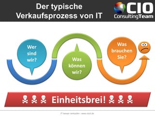 Das Dokument behandelt den typischen Verkaufsprozess im IT-Bereich und betont die Notwendigkeit, Lösungen klar und kundenorientiert zu präsentieren. Es wird hervorgehoben, dass der Wert von IT-Lösungen nicht nur durch technische Aspekte, sondern durch ihre Unterstützung der Kundenbedürfnisse vermittelt werden sollte. Der Text fordert dazu auf, individuelle und spezifische Angebote zu erstellen, um die Einzigartigkeit der Dienstleistungen zu betonen.