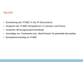 Das Dokument beschreibt die Einordnung der IT-Balanced Scorecard (IT-BSC) in die IT-Governance und deren Rolle bei der Umsetzung von Strategien zur Leistungsüberwachung. Es werden kritische Erfolgsfaktoren und potenzielle Kennzahlen identifiziert, die die Wirksamkeit der IT-BSC beeinflussen, während Ursachen-Wirkungszusammenhänge für deren Anwendung erläutert werden. Eine erfolgreiche Implementierung erfordert ein tiefes Verständnis der Stakeholder, Managementunterstützung und Konsens über strategische Ziele.