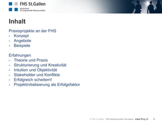 Das Dokument fasst Erfahrungen aus über 100 Praxisprojekten an der FH St. Gallen zusammen, wobei sowohl theoretische als auch praktische Aspekte behandelt werden. Wichtige Erkenntnisse umfassen die Notwendigkeit eines frühen Einbezugs von Stakeholdern, die Bedeutung von kreativen Ansätzen im Projektmanagement sowie die Herausforderungen der objektiven Entscheidungsfindung in komplexen Projektumfeldern. Erfolgreiche Projektinitialisierung wird als entscheidender Erfolgsfaktor hervorgehoben, um kostspielige Fehler zu vermeiden.