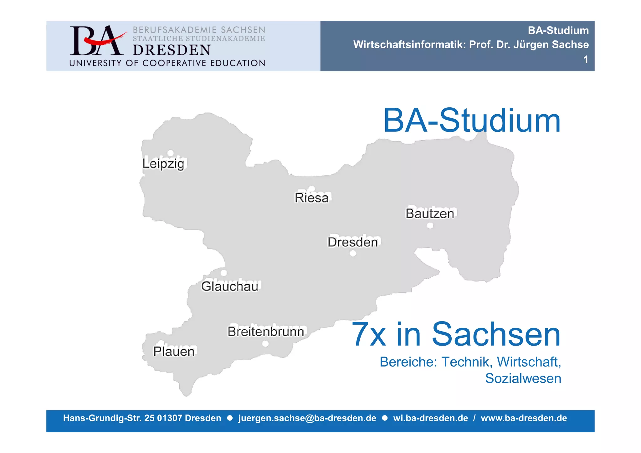 Das Dokument beschreibt das Bachelorstudium in Wirtschaftsinformatik an der Berufsakademie Sachsen unter der Leitung von Prof. Dr. Jürgen Sachse. Es enthält Informationen zu den Kursinhalten, Prüfungsmodalitäten und die Anforderungen an Praxispartner, die für die praktischen Studienabschnitte anerkannt werden müssen. Weitere Details sind auf der Webseite der Akademie verfügbar.