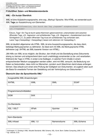 Das Dokument bietet einen Überblick über XML (Extensible Markup Language), eine Auszeichnungssprache, die zur Strukturierung von Daten dient und wichtige Merkmale wie die Trennung von Struktur, Inhalt und Darstellung bietet. Es werden grundlegende Elemente und Regeln für XML-Dokumente erläutert, einschließlich Syntax, Wohlformigkeit und die Verwendung von Attributen. Zudem wird auf die Unterschiede zu HTML sowie die Anwendungen und Standards verwiesen, die mit XML verbunden sind.