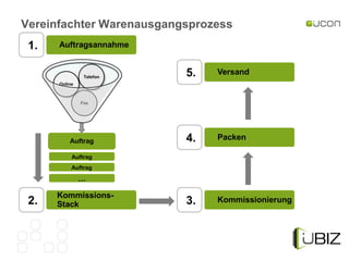 Das Dokument beschreibt einen vereinfachten Warenausgangsprozess mit fünf Hauptschritten: Auftragsannahme, Kommissionierung, Verpacken und Versand. Es umfasst auch Module zur Artikelverwaltung, Lieferantenbestellung und weiteren administrativen Funktionen sowie Features wie Schnittstellenanbindungen und optimierte Bedienmöglichkeiten über Touchscreens. Das Ziel ist die Verbesserung der Usability und die Beschleunigung von Arbeitsabläufen im Logistikbereich.