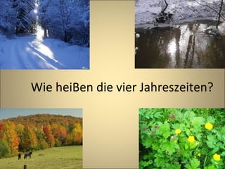 Das Dokument beschreibt die vier Jahreszeiten: Winter, Frühling, Sommer und Herbst, und ihren Einfluss auf das Wetter und die Monate des Jahres. Es vergleicht Temperaturen und Vorlieben für verschiedene Jahreszeiten sowie die damit verbundenen Emotionen und Aktivitäten. Am Ende wird gefragt, welche Jahreszeit die bevorzugte ist.