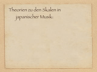Das Dokument behandelt verschiedene Theorien zu japanischen Musikskalen, einschließlich der traditionellen Gagaku-Theorie, Ueharas Theorie der Yo- und In-Skala sowie Koizumis Tetrachordtheorie und Akira Tambas Unterscheidung zwischen metrischen und nicht-metrischen Skalen. Es wird erläutert, dass die Gagaku-Skala eine pythagoräische 12-Ton-Skala ist und dass Ueharas Modell die In-Skala und die Yo-Skala vergleicht, wobei besondere Merkmale wie die Halbtöne in der In-Skala diskutiert werden. Zudem wird Koizumis integrative Theorie erwähnt, die die Quarten als zentrale Struktur der japanischen Musik betrachtet, jedoch auch auf Defizite im Intervallverständnis hinweist.