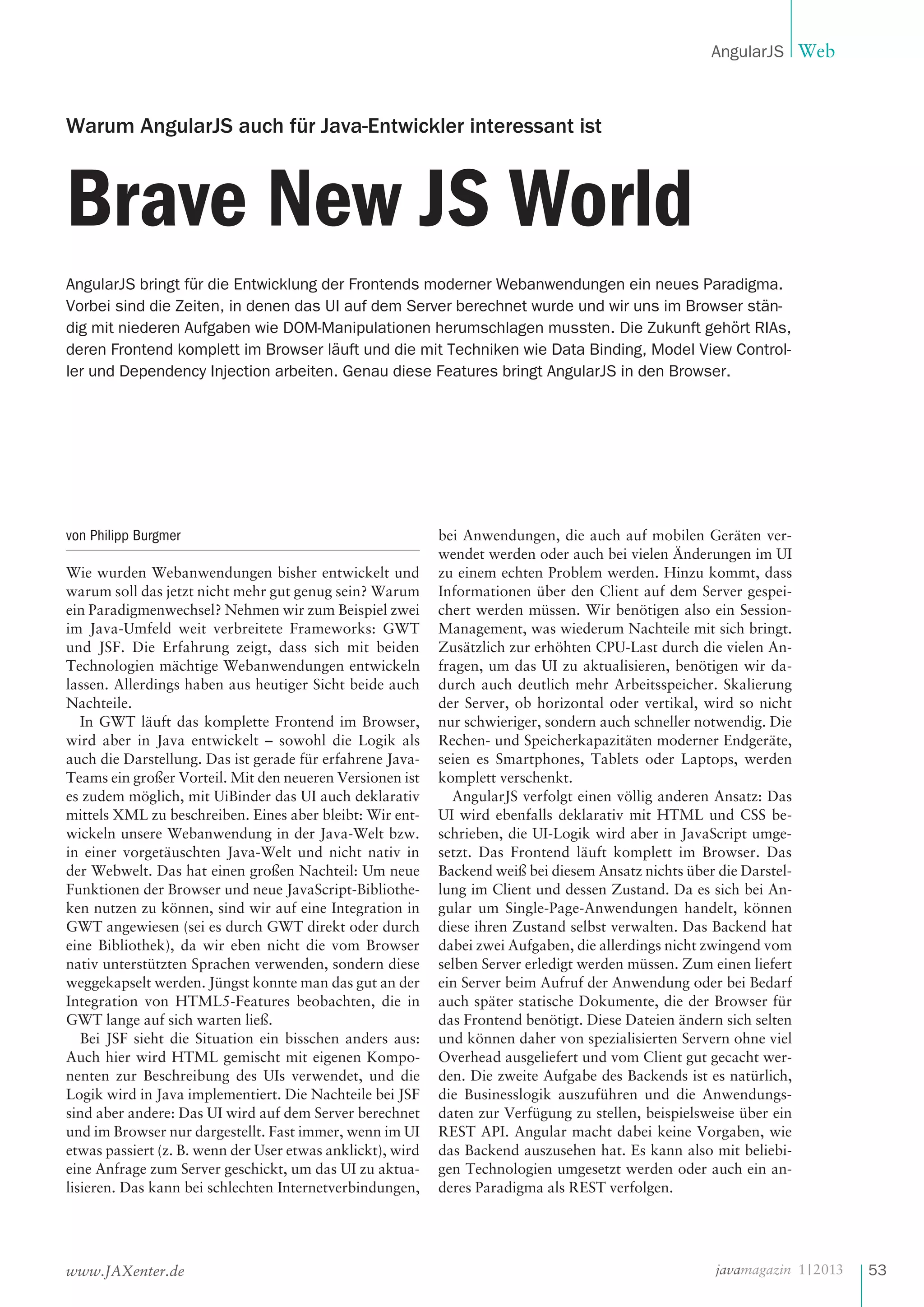 Das Dokument behandelt die Trends und Technologien in der Java-Welt im Jahr 2013, mit einem Schwerpunkt auf AngularJS und dessen Bedeutung für Java-Entwickler. AngularJS bietet eine neue Architektur für die Entwicklung von Webanwendungen, die es ermöglicht, die Frontend-Logik vollständig im Browser auszuführen und dabei moderne Entwicklungsparadigmen wie Datenbindung und dependency injection zu nutzen. Darüber hinaus werden Themen wie Modularität, Testbarkeit und die Verwendung von Direktiven angesprochen, um die Effizienz und Wartbarkeit von Webanwendungen zu verbessern.