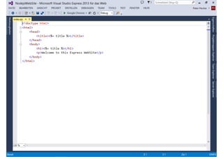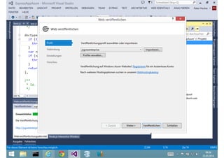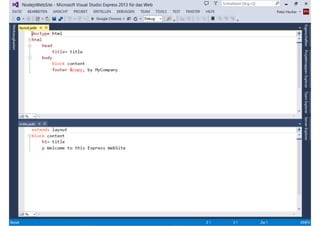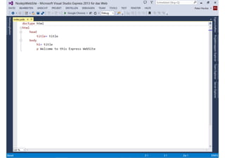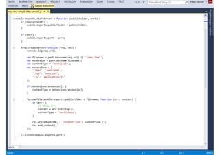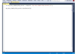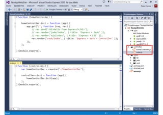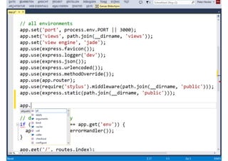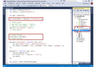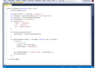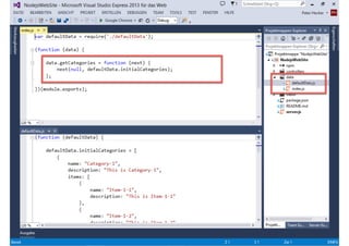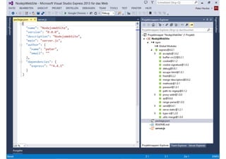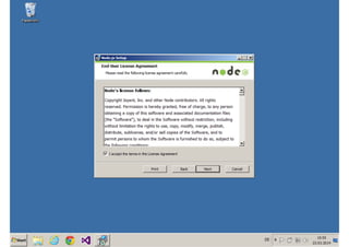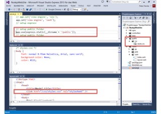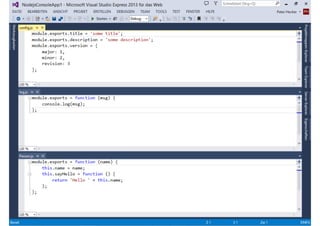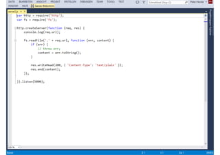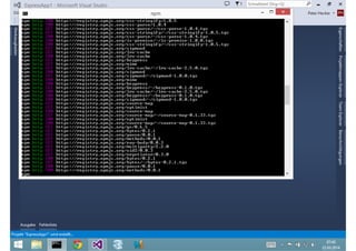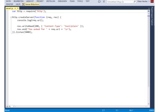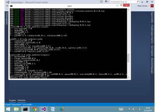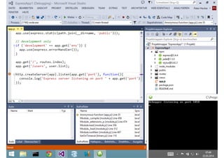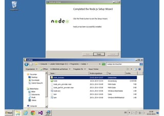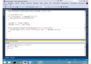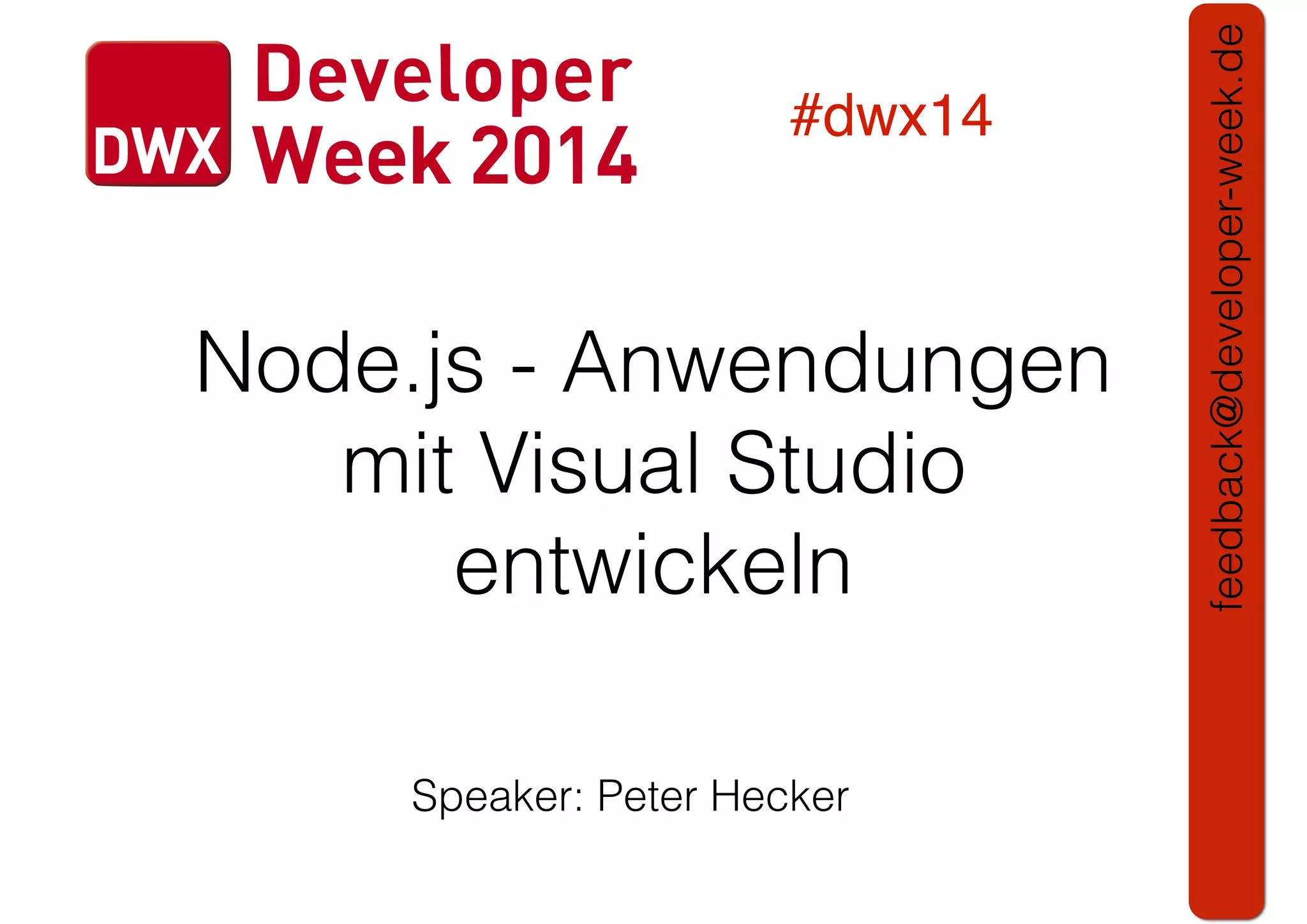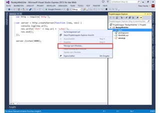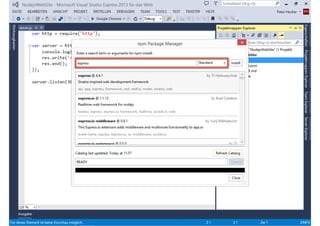 Das Dokument behandelt die Entwicklung von Node.js-Anwendungen mit Visual Studio, einschließlich einer Einführung in Node.js und seiner Integration mit .NET. Es hebt die Architektur von Node.js, dessen Vorteile bei der Entwicklung schneller und skalierbarer Anwendungen sowie verschiedene Anwendungsfälle und Beispiele hervor. Weiterhin werden konkrete Beispiele von Unternehmen wie LinkedIn und Walmart diskutiert, die von der Nutzung von Node.js profitiert haben.