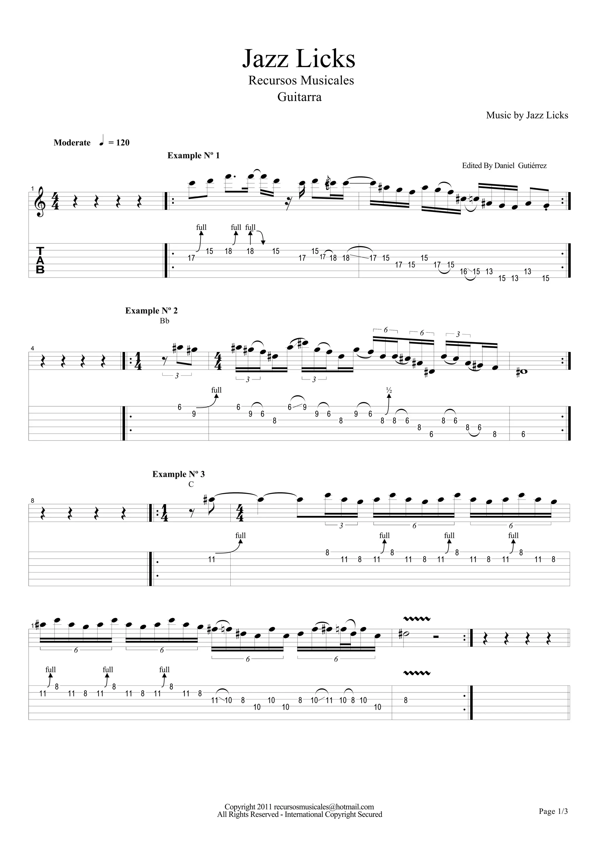 Das Dokument enthält verschiedene Beispiele für Jazz-Licks auf der Gitarre, die eine Reihe von musikalischen Notationen und Strukturierungen zeigen. Es bietet eine Vielzahl von musikalischen Phrasen und thematischen Materialien zur praktischen Anwendung in der Jazzmusik. Die Beispiele sind genormt und beinhalten unterschiedliche Rhythmus- und Melodiefiguren.