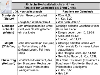 Das Dokument untersucht die Parallelen zwischen jüdischen Hochzeitsbräuchen und der Gemeinde als Braut Christi, insbesondere in Bezug auf Verlobung, Hochzeit und die Dauer der gemeinsamen Zeit. Es diskutiert Konzepte wie Brautpreis, Mitgift, Ehevertrag und die Erwartung der Wiederkunft Christi im Vergleich zu den Traditionen der jüdischen Ehe. Zudem beschreibt es symbolische Elemente wie das Reinigungsbad und den Hochzeitsmahl des Lammes, die in der christlichen Lehre von Bedeutung sind.