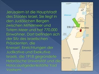 Jerusalem ist die Hauptstadt Israels, gelegen in den judäischen Bergen, mit einer Bevölkerung von 770.000. Die Stadt beherbergt wichtige Institutionen wie den Sitz des Präsidenten, die Knesset, und die hebräische Universität sowie kulturelle Stätten wie die Holocaustgedenkstätte Yad Vashem. Jerusalem hat eine Fläche von 126,4 km² und eine Höhenlage zwischen 606 und 826 m über dem Meeresspiegel.