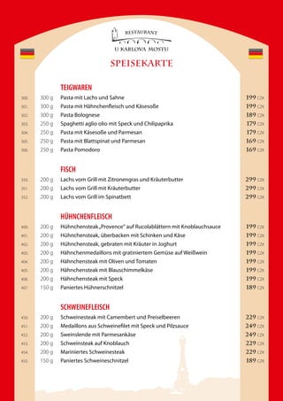 Das Dokument ist eine Speisekarte mit einer Vielzahl von warmen und kalten Vorspeisen, Hauptgerichten, Desserts und Getränken, die von verschiedenen Fleisch- und Fischgerichten bis hin zu vegetarischen Optionen reicht. Die Preise für die Gerichte variieren, und einige spezielle Angebote sind ebenfalls enthalten. Die Speisekarte ist seit dem 1. Juni 2010 gültig und das Restaurant befindet sich in der Nähe der Karlsbrücke in Prag.