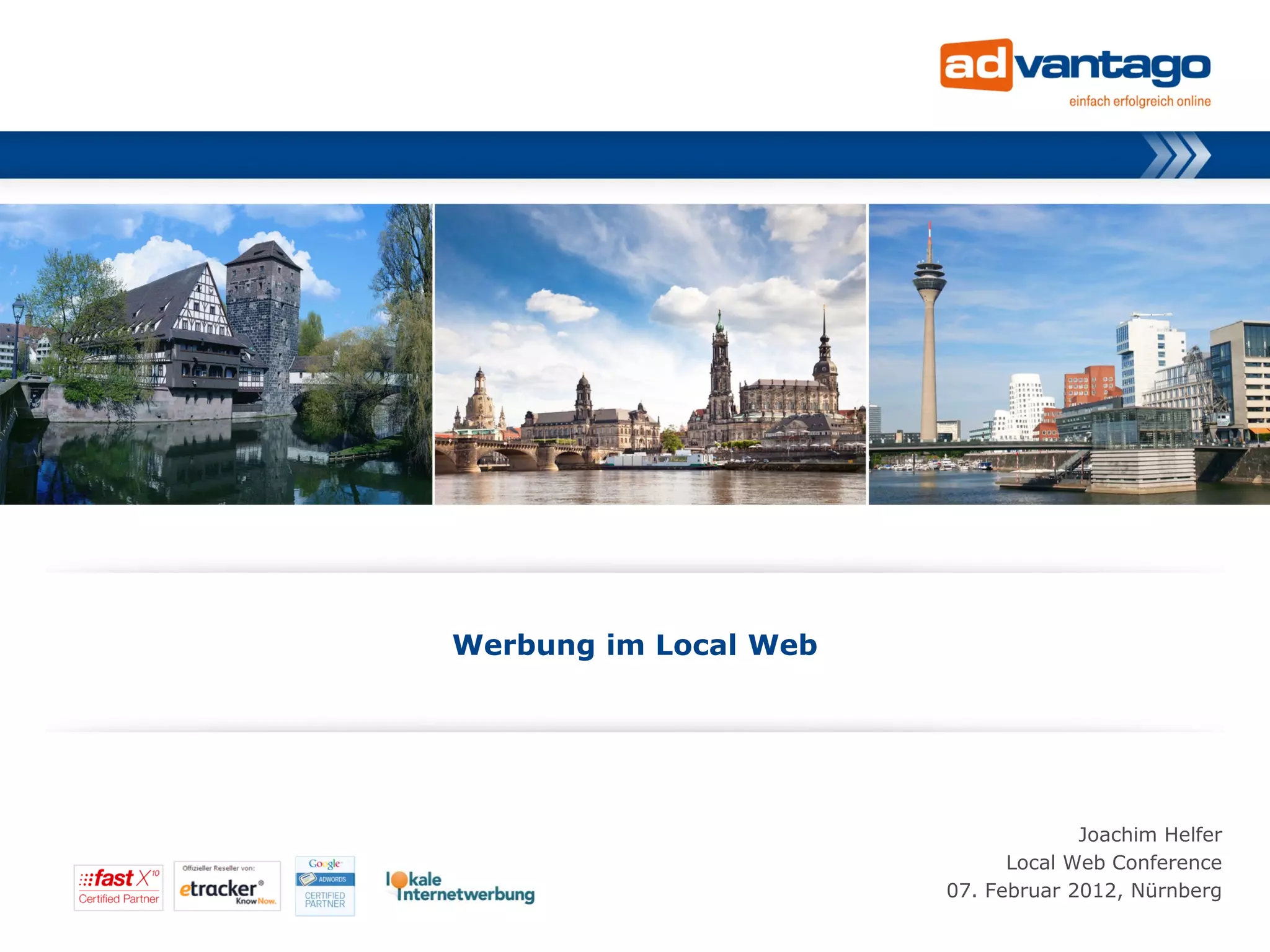 Joachim Helfer präsentiert auf der Local Web Conference 2012 die Möglichkeiten der Werbung für kleine und mittelständische Unternehmen (KMU) im lokalen Internet. Er betont die Bedeutung der Online-Präsenz und diverse Werbemaßnahmen wie Google-Indexierung, Social Media und lokale Verzeichnisse. Die Strategie soll darauf abzielen, die Sichtbarkeit der Unternehmen zu erhöhen und den Kontakt zu potenziellen Kunden zu fördern.