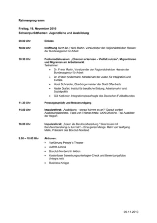 Die Veranstaltung jobaktiv findet am 19. und 20. November 2010 in der Messe Offenbach statt und konzentriert sich auf Informations- und Netzwerkangebote für den Arbeitsmarkt, speziell für Migranten im Rhein-Main-Gebiet. Die Messe bietet Vorträge, Podiumsdiskussionen und Aktionen zu Themen wie Weiterbildung, Anerkennung ausländischer Abschlüsse und Berufsvorbereitung. Verschiedene Institutionen, Arbeitgeber und Bildungsträger stellen ihre Angebote vor und beraten die Besucher.