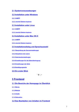 Das Dokument ist ein umfassendes Handbuch für die Nutzung und Verwaltung von Joomla!, welches sowohl technische Anleitungen zur Installation und Gestaltung von Websites als auch die Verwaltung von Inhalten und Benutzern detailliert beschreibt. Es behandelt zahlreiche Aspekte, von der ersten Installation über das Erstellen von Inhalten bis hin zu erweiterbaren Funktionen wie E-Commerce, Foren und Galerien. Zudem enthält es Kapitel zu Tools, Barrierefreiheit und Backup-Strategien, um die Webseite optimal zu betreuen.