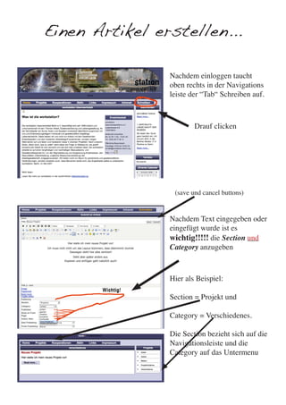 Das Dokument ist ein Joomla-Handbuch für das Erstellen und Bearbeiten von Artikeln sowie das Verwalten von Nachrichten und Terminen in der Workstation. Es beschreibt den Login-Prozess, die Nutzung der Editor-Funktionen, das Hinzufügen und Bearbeiten von Inhalten sowie die Verwendung der Calendar-Extension jevents für die Terminplanung. Zusätzlich gibt es Hinweise zur Fehlersuche und Kontaktinformationen für Unterstützung.