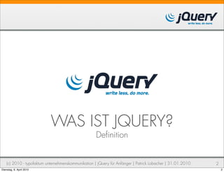 Das Dokument bietet eine Einführung in jQuery, ein populäres JavaScript-Framework, das 2006 von John Resig entwickelt wurde. Es beschreibt die Definition von jQuery, seine Funktionen zur DOM-Manipulation sowie den Zugang zu HTML-Elementen und deren Änderungen. Zudem werden Installation, häufige Probleme und die Nutzung von jQuery in modernen Webdesigns behandelt.