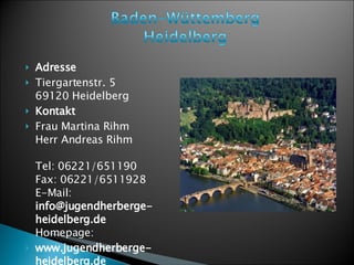 Die Jugendherberge in Heidelberg bietet eine Vielzahl von Unterkünften, darunter Einzel-, Zwei-, Vier- und Sechs-Bettzimmer sowie rollstuhlgerechte Zimmer. Sie liegt in der Nähe von Freizeiteinrichtungen und Sehenswürdigkeiten der Stadt, darunter das berühmte Schloss. In Bamberg gibt es ebenfalls eine Jugendherberge mit verschiedenen Zimmerarten und Freizeitmöglichkeiten, die 2 km von der Altstadt entfernt liegt.