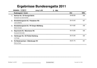 Die Ergebnisse der Bundesregatta 2011 im Jungen Einer (1x) zeigen die Platzierungen und Zeiten der Ruderer aus verschiedenen Landesverbänden. In insgesamt vier Renndurchgängen erreichte die erste Platzierung jeweils unterschiedliche Vereine, darunter der Greifswalder RC und der Duisburger RV. Die Regatta fand am 3. Juli 2011 statt, und alle Ergebnisse wurden von Schiedsrichter Uwe Stöbe veröffentlicht.