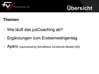 Das Dokument bietet eine Übersicht über das Juscoaching-Programm für Erstsemesterstudierende, einschließlich der Coaching-Termine, Inhalte und organisatorischen Anforderungen. Zudem werden Informationen zu den Pflichtmodulen, ECTS-Punkten und Leistungsnachweisen für das erste Semester bereitgestellt. Ergänzt wird die Übersicht durch Tipps für effektives Lernen und Informationen zu Essensalternativen rund um die Universität.
