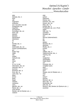 Das Dokument enthält eine Wortschatzliste mit grundlegenden Begriffen und Phrasen aus dem Deutschen, die für die Kommunikation in verschiedenen Alltagssituationen nützlich sind. Es werden auch spezifische Ausdrücke für Österreich und die Schweiz erwähnt. Die Liste umfasst Wörter zu Themen wie Begrüßungen, Familie, Fragen und persönliche Informationen.