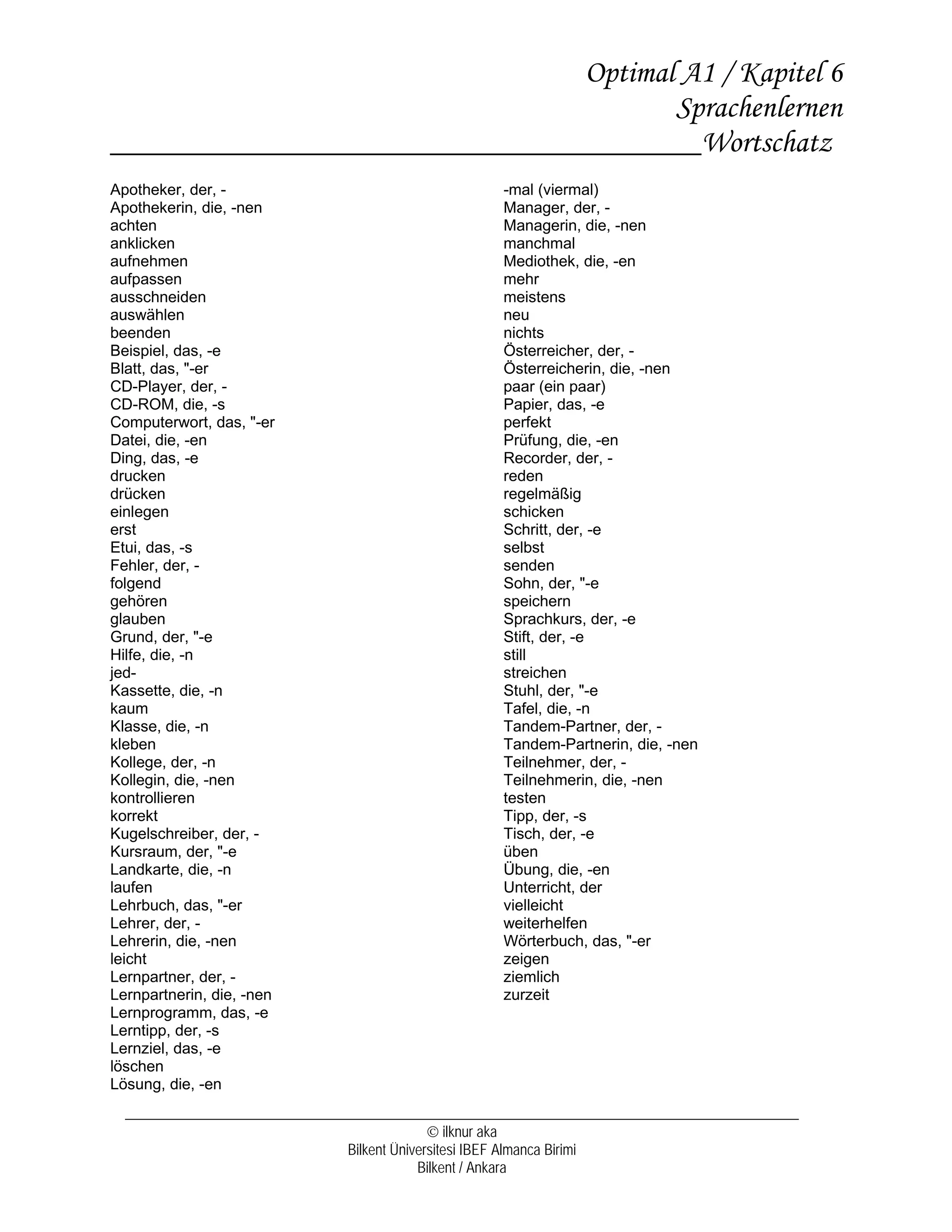 Das Dokument enthält eine Liste von Vokabeln und Begriffen, die mit dem Thema Sprachenlernen und der Lernumgebung verbunden sind. Es behandelt verschiedene Wörter, die im Kontext eines Sprachkurses und des Lernens nützlich sind, einschließlich Begriffe zu Lehrern, Lernmaterialien und Hilfsmitteln. Zudem werden verschiedene Tätigkeiten im Zusammenhang mit dem Sprachlernen aufgeführt.