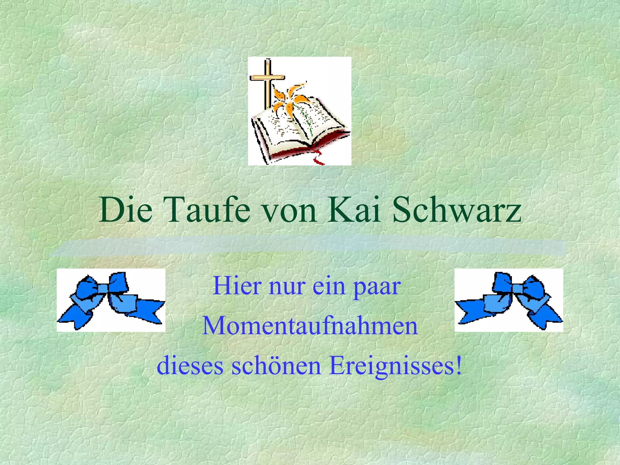 Das Dokument beschreibt die Taufe von Kai Schwarz und enthält einige Momentaufnahmen von diesem Ereignis. Es betont die schönen Momente im Familienkreise, ohne weitere Details zu liefern. Der Text endet mit einer humorvollen Bemerkung über das Ende des Ereignisses.