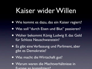 Das Dokument behandelt die Entstehung des Deutschen Kaiserreichs und die Rolle von Kaiser Wilhelm I. sowie Otto von Bismarck in diesem Prozess. Es diskutiert die politischen und wirtschaftlichen Bedingungen, die zur Vereinigung Deutschlands führten, sowie die Auswirkungen des Krieges von 1866 und die Gründung des Kaiserreichs im Jahr 1871. Trotz einer Verfassung und eines Parlaments gab es keine wirkliche Demokratie, da die Macht bei Kaiser, Bismarck und den Fürsten lag.
