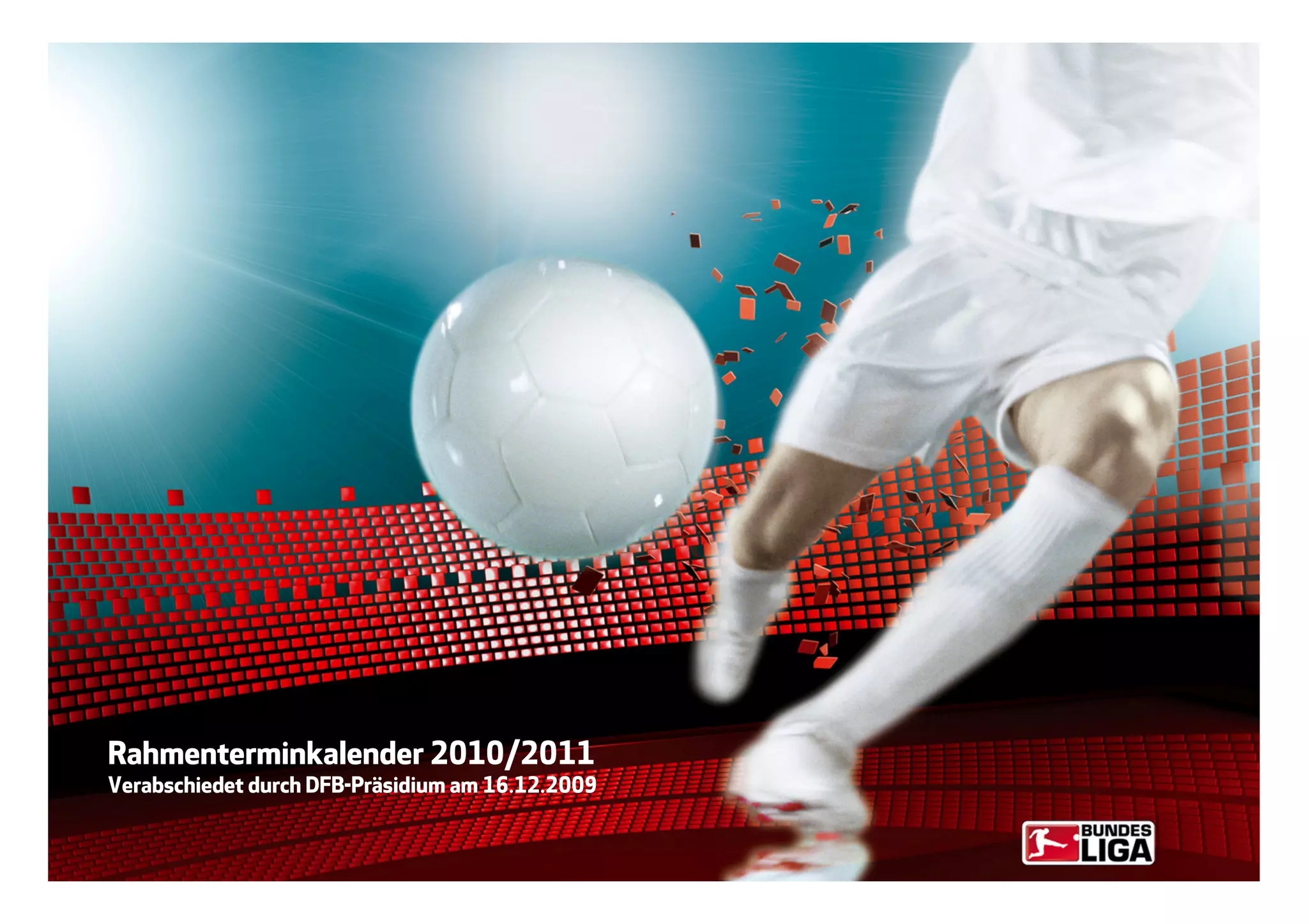 Der Rahmenterminkalender für die Saison 2010/2011 wurde am 16. Dezember 2009 vom DFB-Präsidium beschlossen und enthält wichtige Termine für nationale und internationale Fußballturniere, einschließlich der FIFA-Weltmeisterschaft und UEFA-Wettbewerbe. Das Dokument listet die Termine für Länderspiele der A-Nationalmannschaft, U21-Teams sowie den DFB-Pokal und weitere relevante Veranstaltungen auf. Die Übersicht umfasst Zeiträume von Juni 2010 bis Januar 2011 mit wöchentlichen Informationen.
