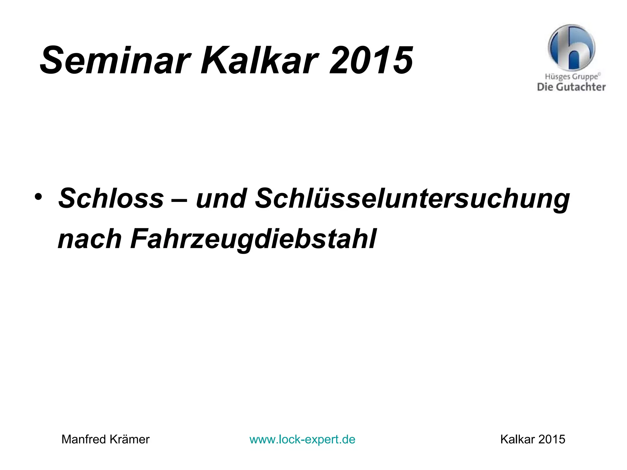 Das Dokument von Manfred Krämer behandelt die verschiedenen Aspekte der Sicherheitstechnik im Kontext von Fahrzeugschlössern und -schlüsseln, insbesondere nach Fahrzeugdiebstählen. Es werden technische Details zu verschiedenen Schlüsselarten, Transpondertechnologien und Methoden zur Fahrzeugöffnung sowie zur Analyse von Diebstählern erörtert. Zudem werden wichtige Überlegungen zu Manipulationen und der Ermittlungsarbeit nach Diebstählen angestellt, um Fälschungen und Betrug nachzuweisen.