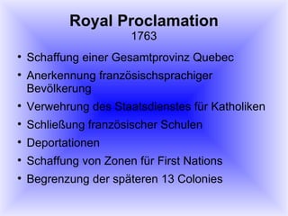 Das Dokument behandelt die Geschichte und Entwicklungen in Kanada von der französischen Kolonialzeit bis zur modernen Ära, einschließlich wichtiger Ereignisse wie den Verlust von Neufrankreich 1763, den Pontiac-Aufstand, die Gründung von Quebec, die Konflikte zwischen den Provinzen und der Zentralregierung sowie bedeutende politische Akte und Referenden. Es werden auch das Verhältnis zu den USA sowie militärische Engagements Kanadas in internationalen Konflikten thematisiert. Die gesellschaftlichen Veränderungen und die politischen Spannungen in Quebec finden ebenfalls Erwähnung, insbesondere im Hinblick auf die Bewegung für die Unabhängigkeit und die Verfassungsreformen.