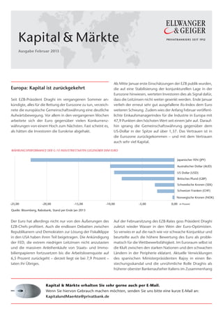 Die Februar-Ausgabe von Kapital & Märkte berichtet über die Rückkehr des Kapitals in die Eurozone, unterstützt von positiven Indizes und dem Vertrauen der Investoren in die Euro-Währung. Trotz stabiler Anzeichen in der Eurozone bleibt die wirtschaftliche Lage angespannt, insbesondere in schwächeren Ländern wie Spanien und Frankreich, die mit politischen Risiken und einer hohen Arbeitslosigkeit konfrontiert sind. Während die EZB wahrscheinlich die niedrigen Zinssätze beibehalten wird, gibt es zunehmend Bedenken hinsichtlich der Wettbewerbsfähigkeit des Euro gegenüber anderen Währungen.