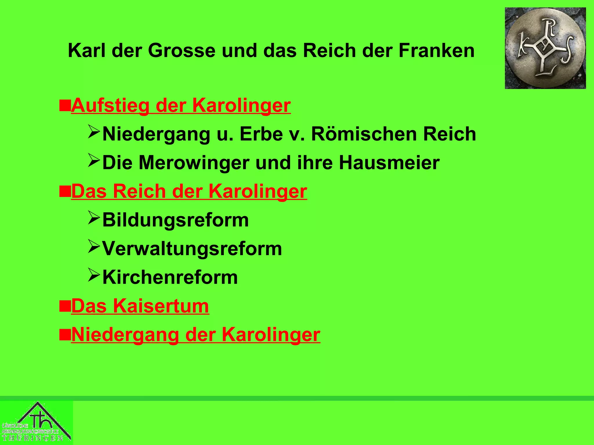Das Dokument behandelt die historische Entwicklung des Frankenreichs unter Karl dem Großen und den Karolingern, einschließlich der Merowinger und der politischen sowie sozialen Reformen dieser Zeit. Es beschreibt den Niedergang des Weströmischen Reiches, den Einfluss der Völkerwanderung und die Etablierung des Christentums als zentralem Machtfaktor. Zudem wird der dynastische Wechsel von den Merowingern zu den Karolingern und die Stärkung der königlichen Autorität durch kirchliche Salbungen thematisiert.