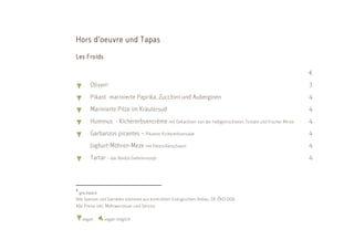 Das Dokument enthält eine umfangreiche Speisekarte mit mediterranen, vegetarischen Gerichten, darunter verschiedene Vorspeisen, Suppen, Salate, Hauptgerichte und Desserts, alles aus kontrolliert biologischem Anbau. Die Gerichte bieten eine Vielzahl von Optionen, darunter vegane Möglichkeiten, und sind in Euro mit Mehrwertsteuer und Service angegeben. Der Text hebt die Verwendung frischer Zutaten und traditioneller Rezepte hervor.