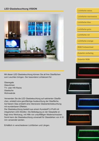 Die LED-Glasbeleuchtung von Trendlicht ermöglicht das Beleuchten von Glasflächen in verschiedenen Farben und Längen, geeignet für satinierte und klare Materialien mit einer Dicke von 4-10 mm. Die Montage erfolgt einfach und werkzeuglos, und die LED-Streifen bieten eine Lebensdauer von bis zu 50.000 Stunden bei niedrigem Energieverbrauch. Zubehör für Anschluss und Steuerung, einschließlich RGB-Farbwechsel, ist ebenfalls erhältlich.