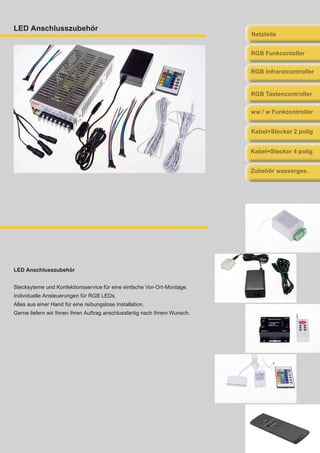 Das Dokument bietet eine umfassende Übersicht über LED-Anschlusszubehör, einschließlich einer Vielzahl von Stromversorgungen, Controllern und Installationskomponenten für RGB-LEDs. Es enthält technische Daten zu verschiedenen Schaltnetzteilen und deren Anwendungen, sowie Informationen zu Funk- und Infrared-Controllern zur Steuerung von LED-Beleuchtung. Trendlicht.de wird als Anbieter genannt, der maßgeschneiderte Installationslösungen und Produkte bereitstellt.