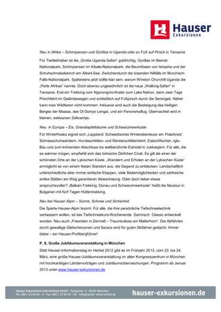Hauser Exkursionen feiert 2013 sein 40-jähriges Bestehen mit einem neuen Look und einem Jubiläumskatalog, der zahlreiche Neuentwicklungen in verschiedenen Regionen bietet, einschließlich Reisen nach Asien, Amerika, Afrika und Europa. Die Angebote reichen von Familienreisen in Sri Lanka bis hin zu einzigartigen Safaris in Uganda und Trekkingtouren in Lappland. Das Unternehmen ist führend im Bereich nachhaltiger Reisen und bietet eine Vielzahl von Routen für unterschiedliche Schwierigkeitsgrade an.