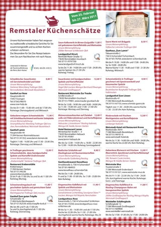 Das Dokument beschreibt das Event 'Remstaler Küchenschätze', das vom 25. Februar bis 27. März 2011 stattfindet und traditionelle schwäbische Gerichte nach Großmutters Rezepten präsentiert. Die aufgeführten Gerichte sind in zahlreichen Gastronomiebetrieben verfügbar und reichen von saurem Kalbsnierle bis zu verschiedenen Weinempfehlungen. Die Preise für die Gerichte liegen zwischen 8,50 und 12,00 Euro.