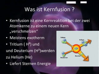 Kernfusion ist eine Reaktion, bei der Wasserstoffisotope zu Helium verschmelzen und große Mengen an Energie freisetzen, die in Strom umgewandelt werden können. Obwohl Kernfusion potenzielle Vorteile wie unbegrenzte Brennstoffressourcen und minimale Umweltbelastungen bietet, sind die Reaktoren teuer und ihre Machbarkeit ist noch nicht in großem Maßstab erforscht. Wissenschaftler forschen auch an kalter Fusion, die theoretisch in einem Wasserglas funktionieren könnte, jedoch sind diese Ansätze noch umstritten.
