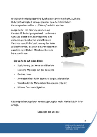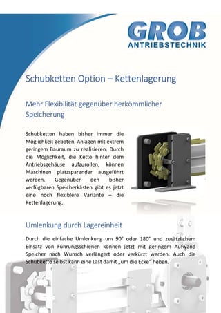 Die Schubkettenlagerung bietet im Vergleich zu herkömmlichen Speichermethoden mehr Flexibilität, Platzersparnis und die Möglichkeit, Lasten um Ecken zu heben. Zudem kann die Hubgeschwindigkeit auf bis zu 600 mm/s erhöht werden, und die Montage ist einfach und geräuscharm. Die Lösung ermöglicht einen dezentralen Antrieb und bietet verschiedene Materialkombinationen.