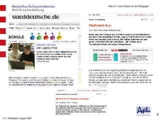 Das Dokument beleuchtet die Chancen von Web 2.0 für die Pädagogik, wobei der Fokus auf der Nutzung partizipativer Technologien in Schulen liegt. Es werden Veränderungen in der Rolle von Lehrern und Lernenden unterstrichen, die von traditionalistischem Wissenstransfer zu kollaborativem und selbstorganisiertem Lernen übergehen. Zudem wird die Notwendigkeit einer angepassten Web-Didaktik und Informationskompetenz 2.0 hervorgehoben, um die Qualität des Unterrichts zu verbessern.