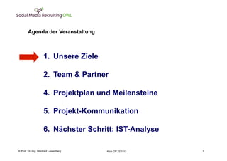 Das Dokument beschreibt das Kick-off-Meeting für ein Modellprojekt der Fachhochschule des Mittelstands zur Sicherstellung und Entwicklung von Fachkräften in mittelständischen Unternehmen in Ostwestfalen-Lippe. Schwerpunkte des Projekts sind die Implementierung einer Arbeitgebermarkenstrategie zur Verbesserung des Unternehmensimages, die Mitarbeitergewinnung und -bindung sowie die Nutzung sozialer Medien. Die Projektlaufzeit ist von Dezember 2010 bis März 2014, mit einem Budget von 274.000 Euro, gefördert zur Hälfte vom Staat.
