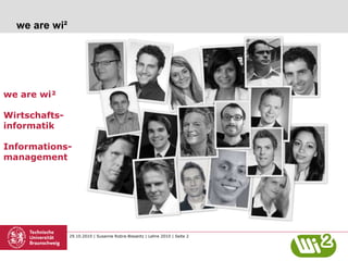 Das Dokument stellt die Lehrinhalte und -formate des Studienbereichs Wirtschaftsinfo matik am wi2 vor, insbesondere die Schwerpunkte auf E-Services, Informationsmanagement und Web 2.0. Es beschreibt verschiedene Veranstaltungen, Seminare und Projekte, die sich mit Themen wie elektronischen Märkten, Kundenanforderungen und innovativer Dienstgestaltung beschäftigen. Darüber hinaus werden Möglichkeiten für Studierende zur Teilnahme an praktischen Projekten und zur Entwicklung von Schlüsselqualifikationen hervorgehoben.