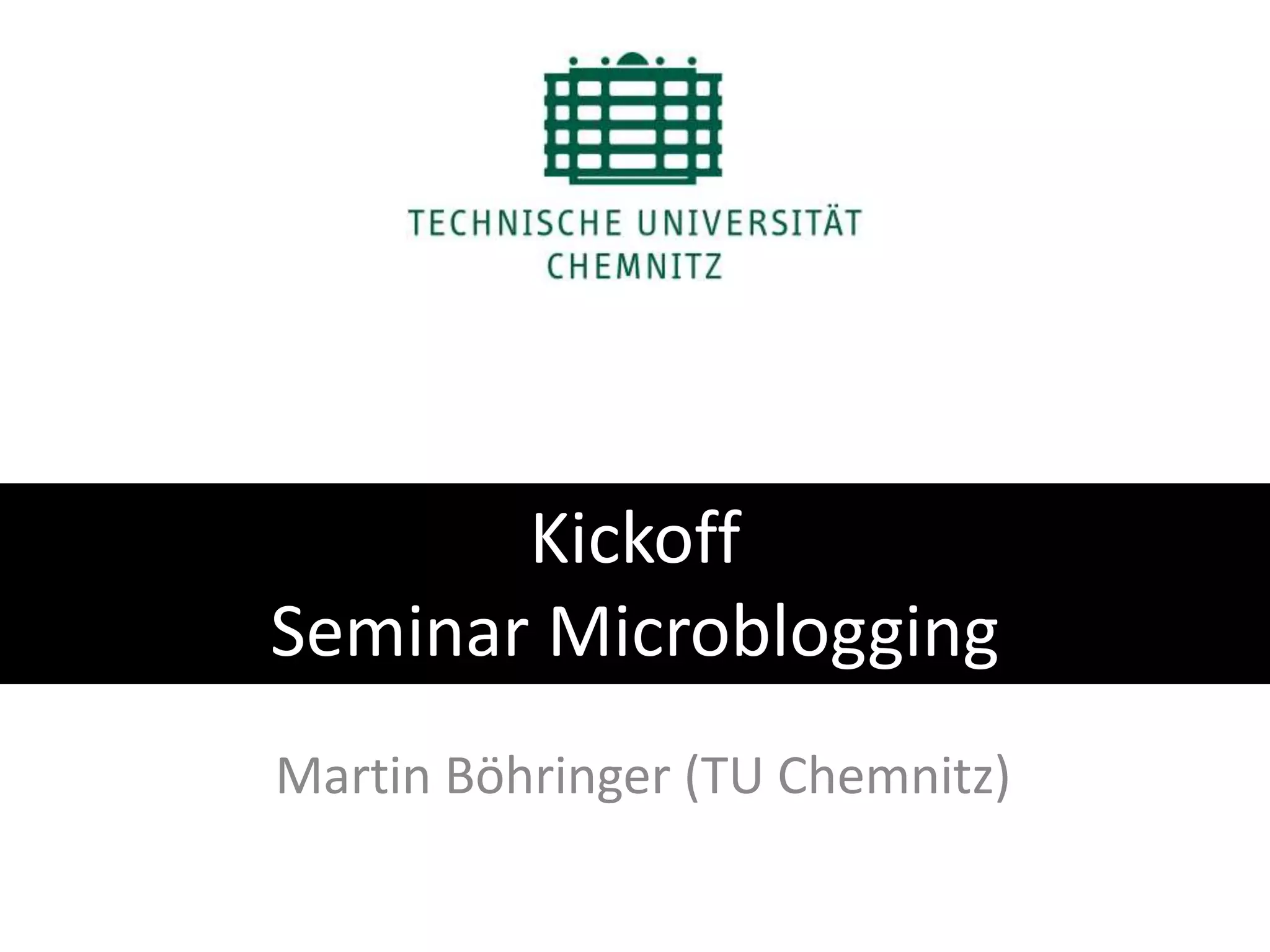 Das Kickoff-Seminar zum Thema Microblogging, geleitet von Martin Böhringer von der TU Chemnitz, stellt verschiedene Themen und Forschungsansätze vor, darunter die Anwendung von Microblogging in Unternehmen und die Integration nicht-menschlicher Quellen. Teilnehmer werden ermutigt, eigene Themenvorschläge einzubringen, und es wird ein Plan zur Organisation und Durchführung wissenschaftlicher Arbeiten vorgestellt, einschließlich detaillierter Anforderungen für die Seminararbeiten. Es werden zudem Ressourcen und Leitfäden für wissenschaftliches Arbeiten bereitgestellt.