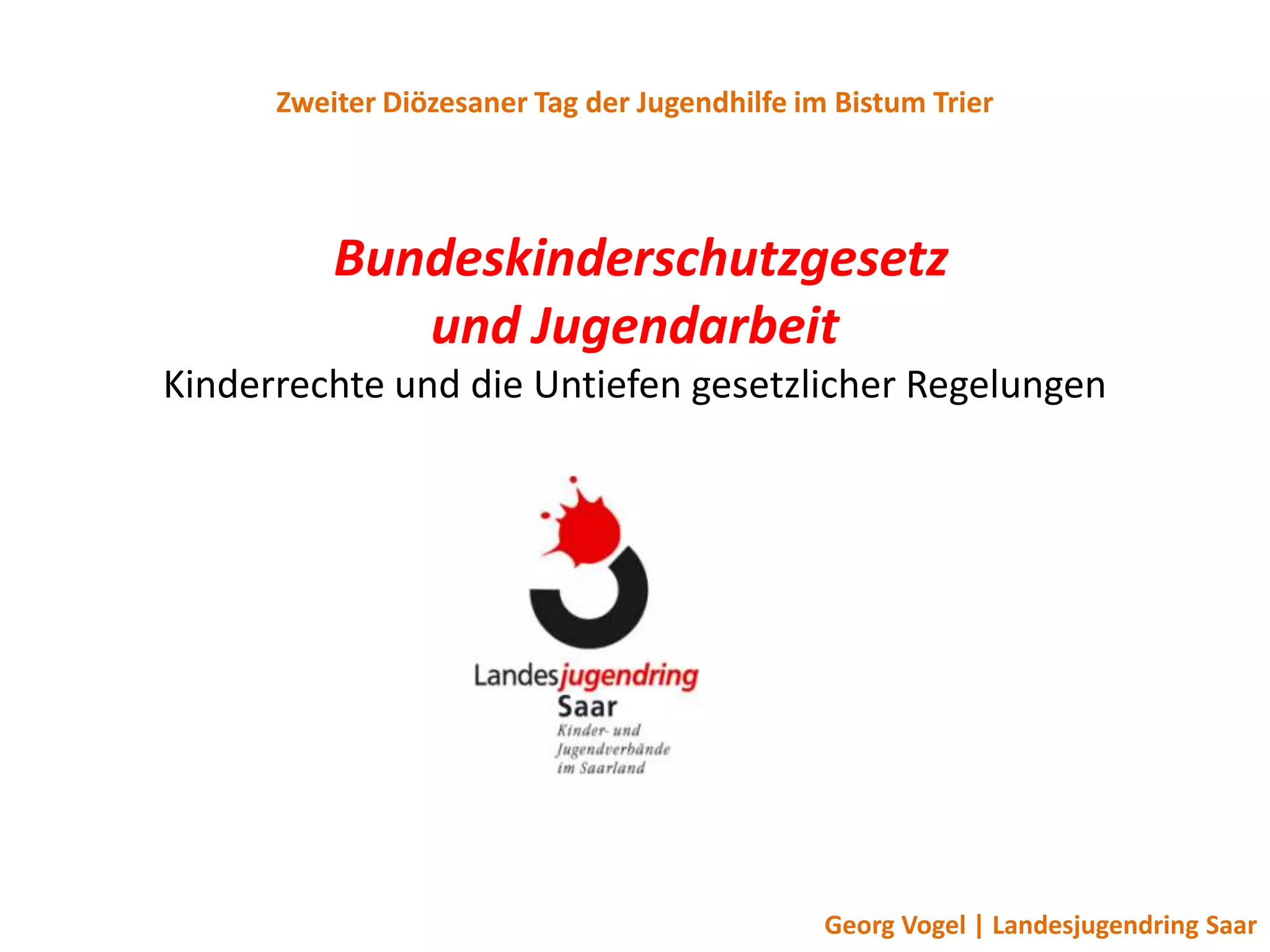 Das Dokument behandelt den zweiten diözesanen Tag der Jugendhilfe im Bistum Trier, fokussiert auf das Bundeskinderschutzgesetz und dessen Auswirkungen auf die Jugendarbeit. Es werden wichtige Regelungen wie Befugnisse für Berufsgeheimnisträger, den Ausschluss einschlägig vorbestrafter Personen sowie verbindliches Qualitätsmanagement hervorgehoben. Zudem wird auf die Herausforderungen für ehrenamtliche Tätige und die Notwendigkeit von Präventionsmaßnahmen eingegangen.