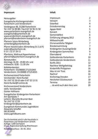 Der Kirchenbote der evangelischen Kirchengemeinden Partenheim und Vendersheim informiert über bevorstehende Veranstaltungen, darunter Gottesdienste zu Karfreitag und Ostern, sowie ein Gemeindefest am 15. Mai 2011. In einem Vorwort wird die Bedeutung des Frühlings als Wendezeit hervorgehoben, während gleichzeitig auf aktuelle weltliche Herausforderungen wie Naturkatastrophen und Kriege hingewiesen wird. Die Hoffnung und der zentrale Glaubensinhalt von Ostern werden als entscheidende Wende im christlichen Glauben dargestellt.